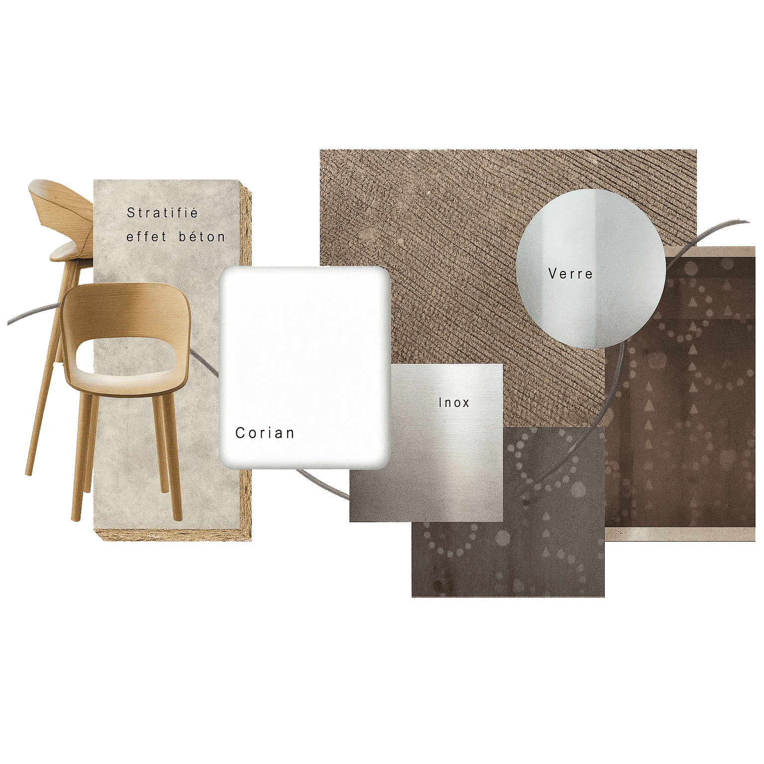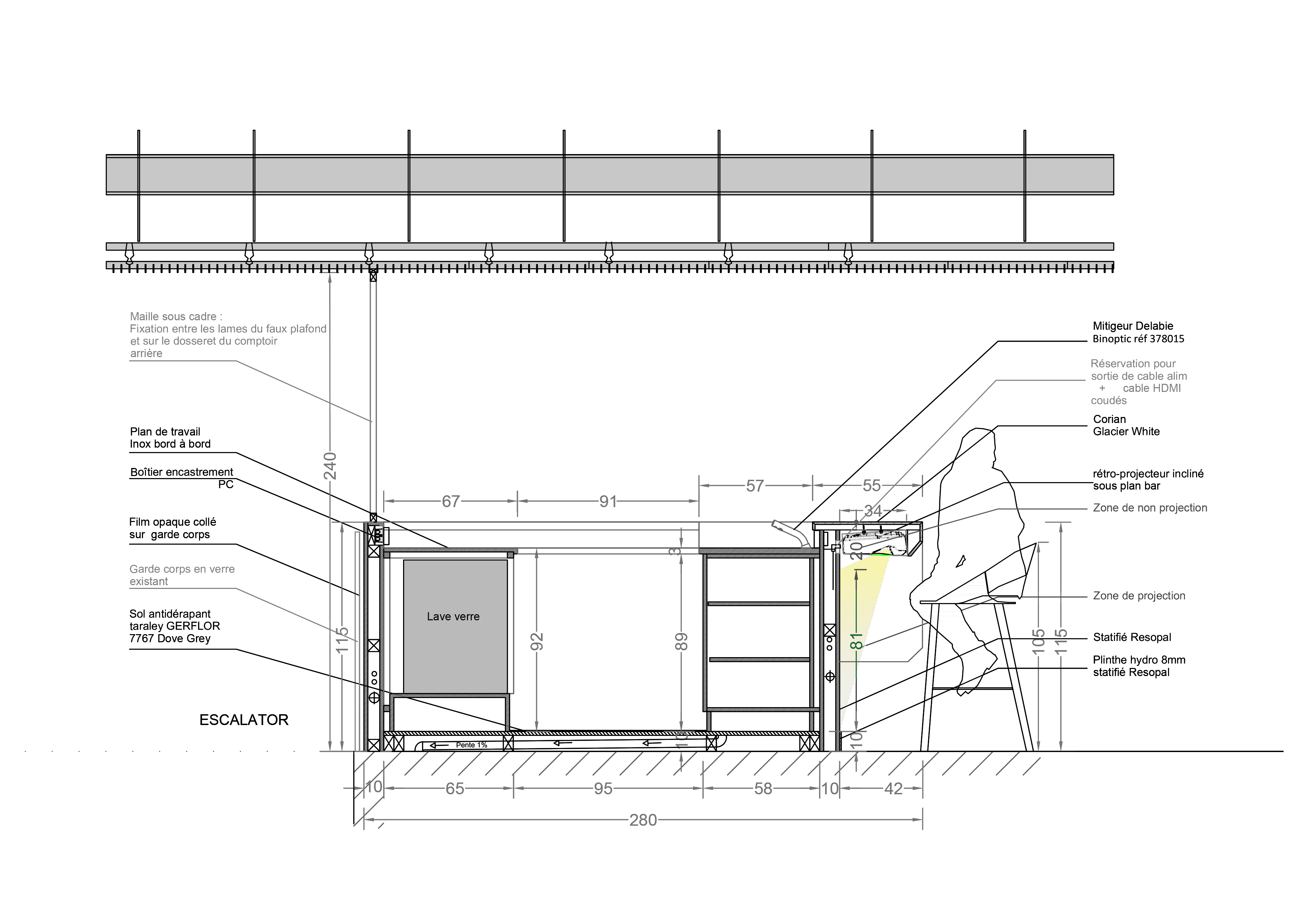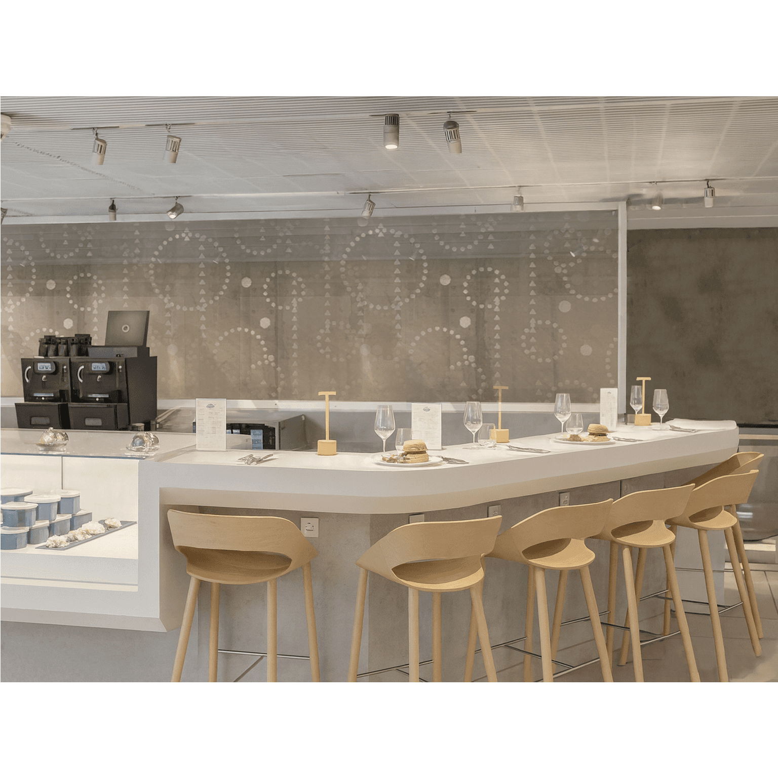 Ce comptoir est une réinterprétation contemporaine de l’univers du Café Prunier : une ode discrète mais assumée à son langage graphique. Les motifs d’esturgeons et de bulles y sont traduits sur la maille métallique transparente, dialoguant avec les projections lumineuses sur la paroi verticale.