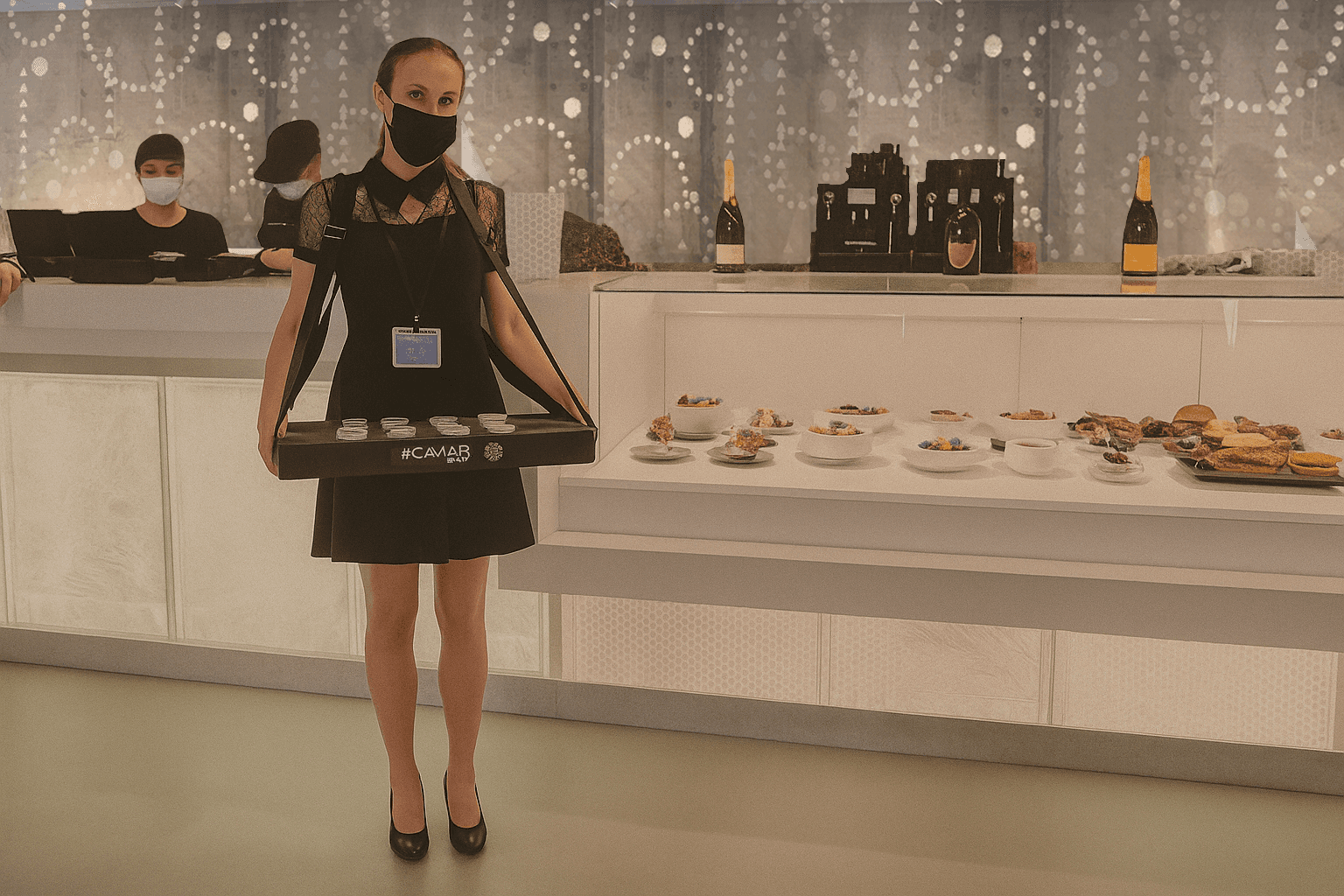 Bien que l’esthétique s’oriente vers une écriture plus urbaine, l’ensemble reste façonné avec des matériaux haut de gamme et des finitions travaillées. Sous le comptoir, des projecteurs intégrés diffusent des animations qui prolongent l’identité visuelle et renforcent l’effet immersif.